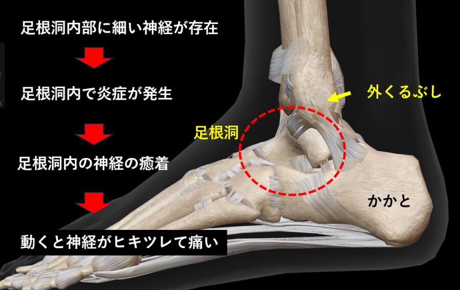 これらの要因で足根洞内の靭帯や脂肪組織に炎症が起き、慢性化していきます。