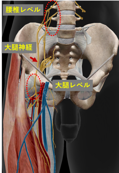 腰から足の付け根を通って、太ももへと伸びる大きな神経。これが「大腿神経」です。