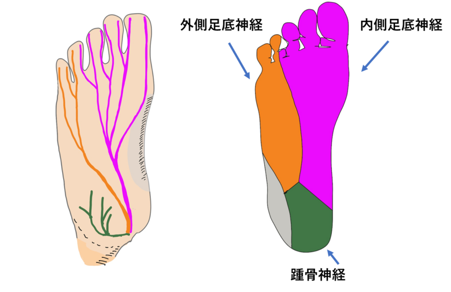 内側足底神経/外側足底神経/踵骨神経に分かれる - それぞれ支配領域が違うため、しびれの場所が鑑別の手がかりになる