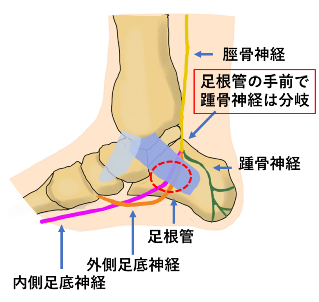- 足根管症候群では、踵がしびれないこともある(踵骨神経が手前で分岐するため)