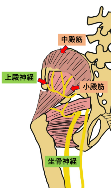 上殿神経は中殿筋と小殿筋の間を通っており、筋間で神経が絞扼されることが多いです。