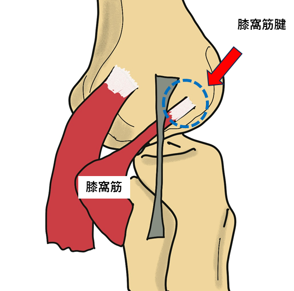 膝を横から見た図:膝窩筋腱を押すと痛みが走るのが特徴